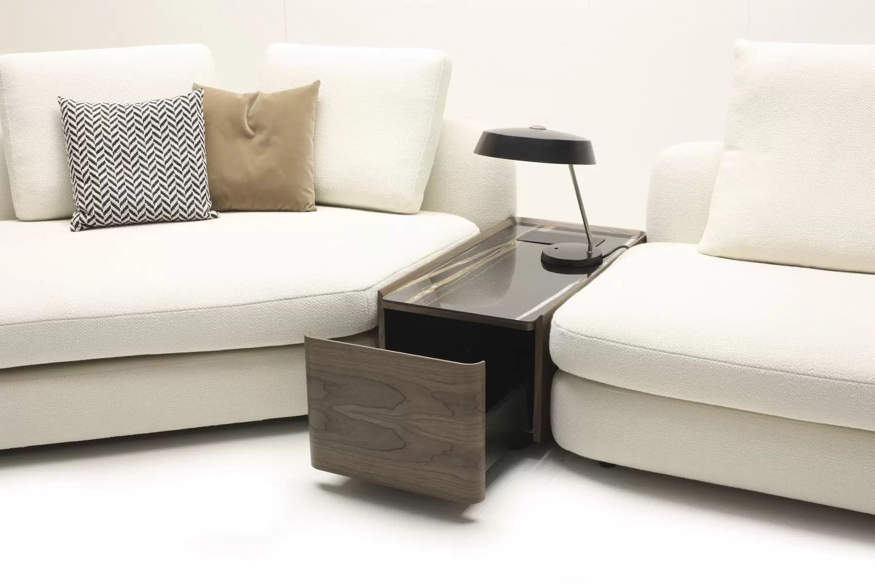 В середине или по бокам дивана может размещаться модуль с ящиком и встроенным блоком со стандартными розетками и USB-разъемами, что делает эту модель еще более функциональной.