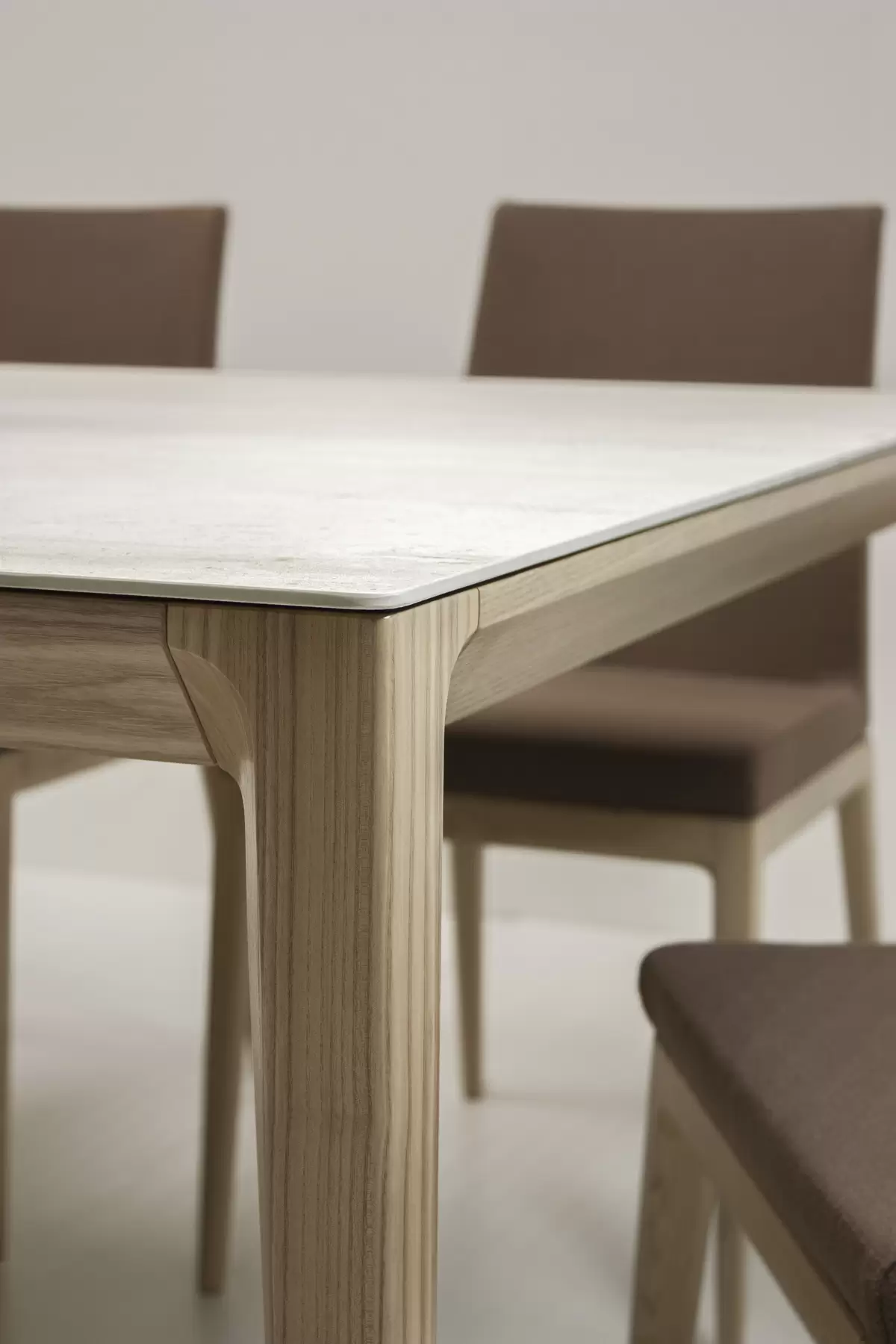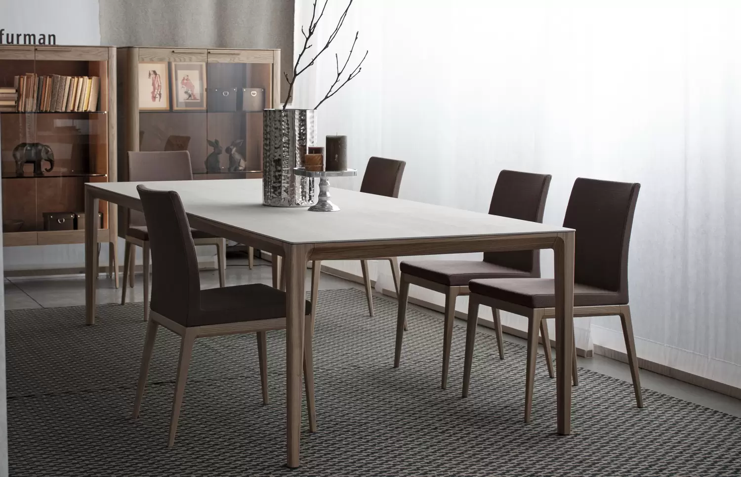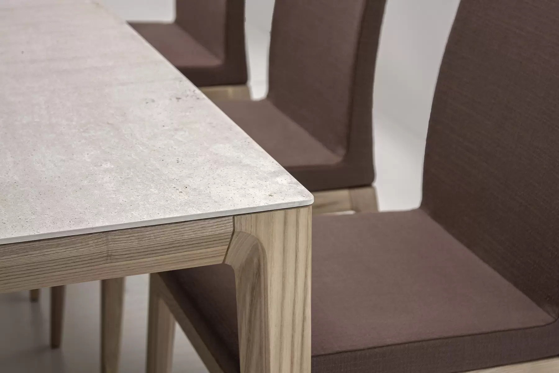 Конструкция стола включает тонкую скошенную столешницу, усиленную металлическим каркасом, что обеспечивает долговечность и прочность. Текстура массива ясеня на опорах и каркасе, добавляет натуральности и тепла, создавая ощущение природной гармонии. Стол доступен в длине до 2,75 метра, что позволяет удобно разместить до 12 человек. Благодаря этому Demy идеально подходит