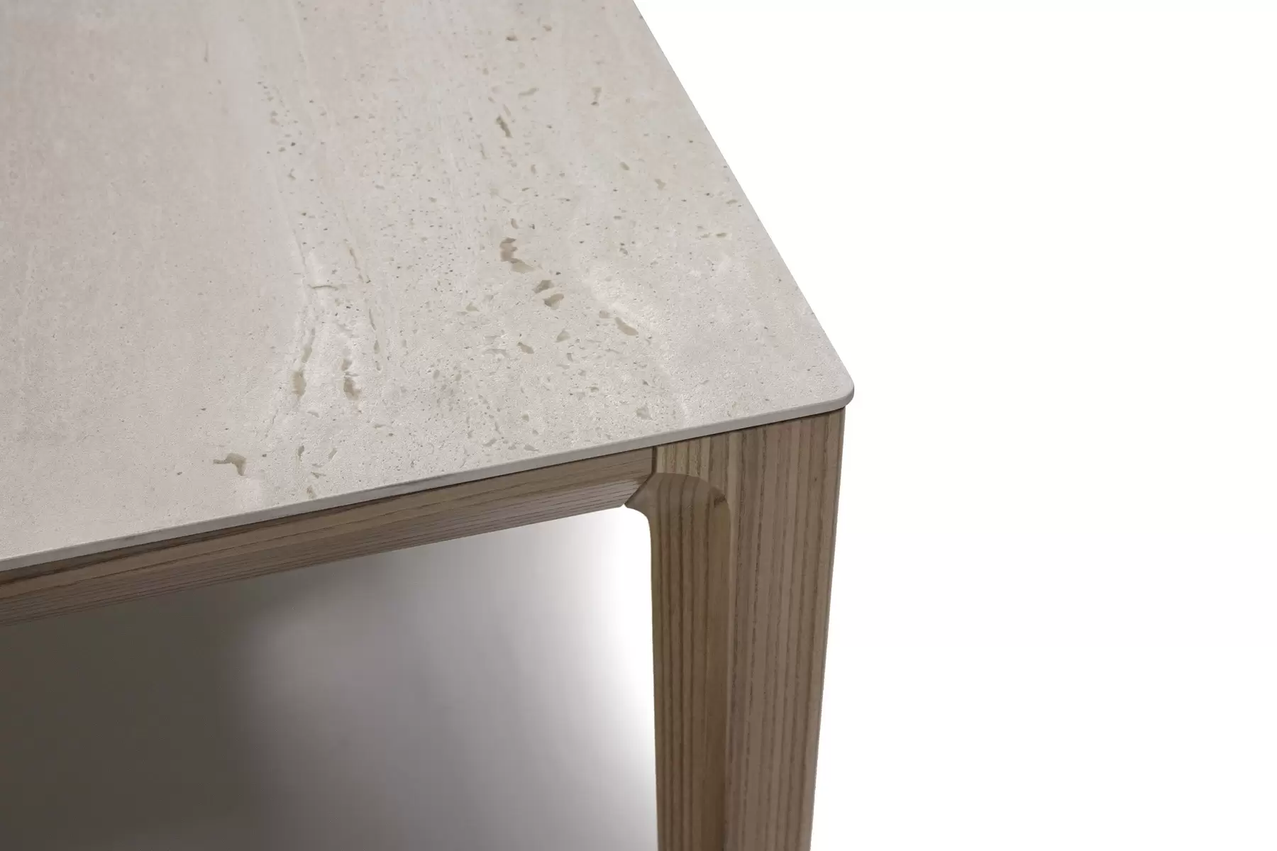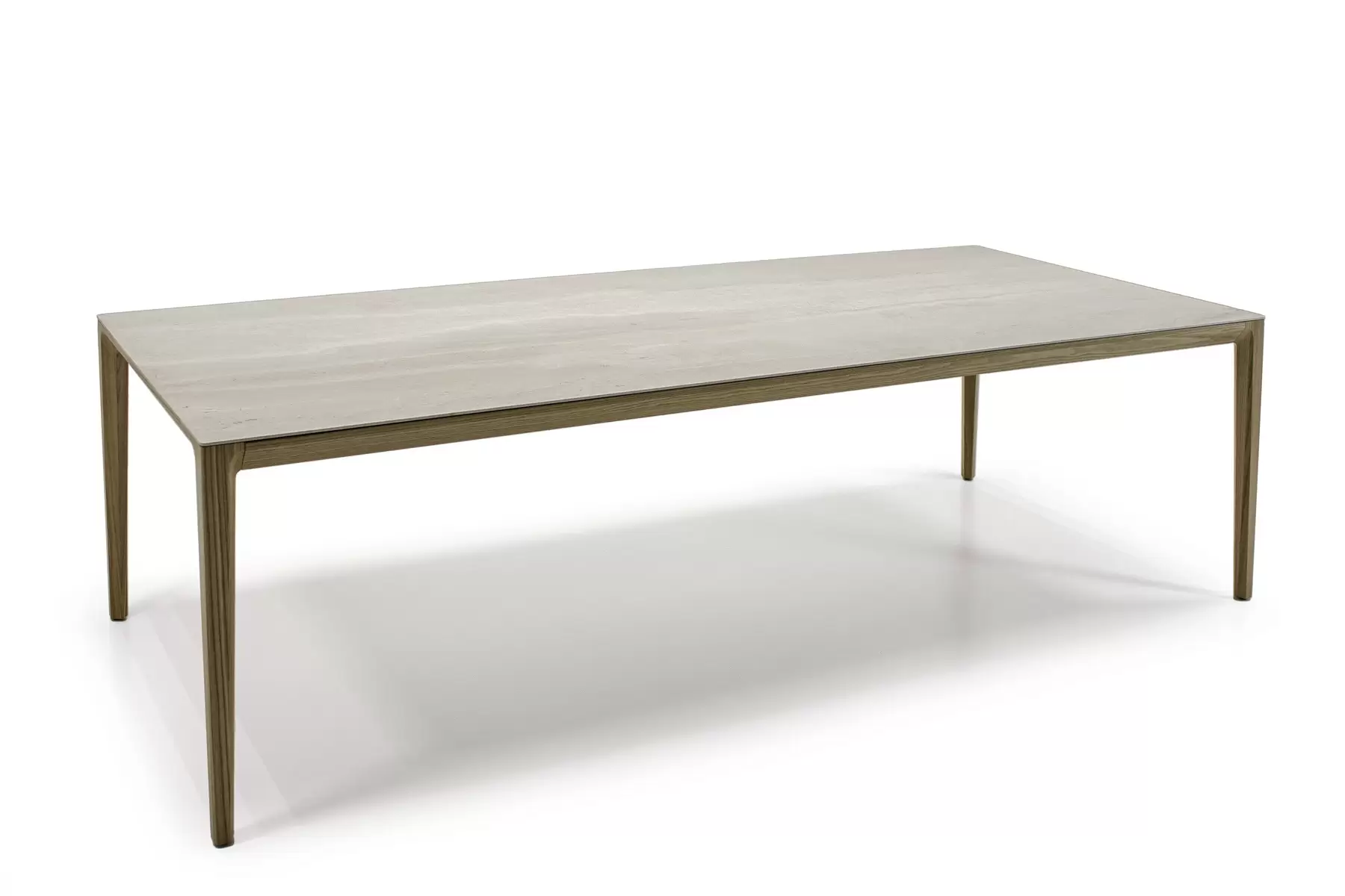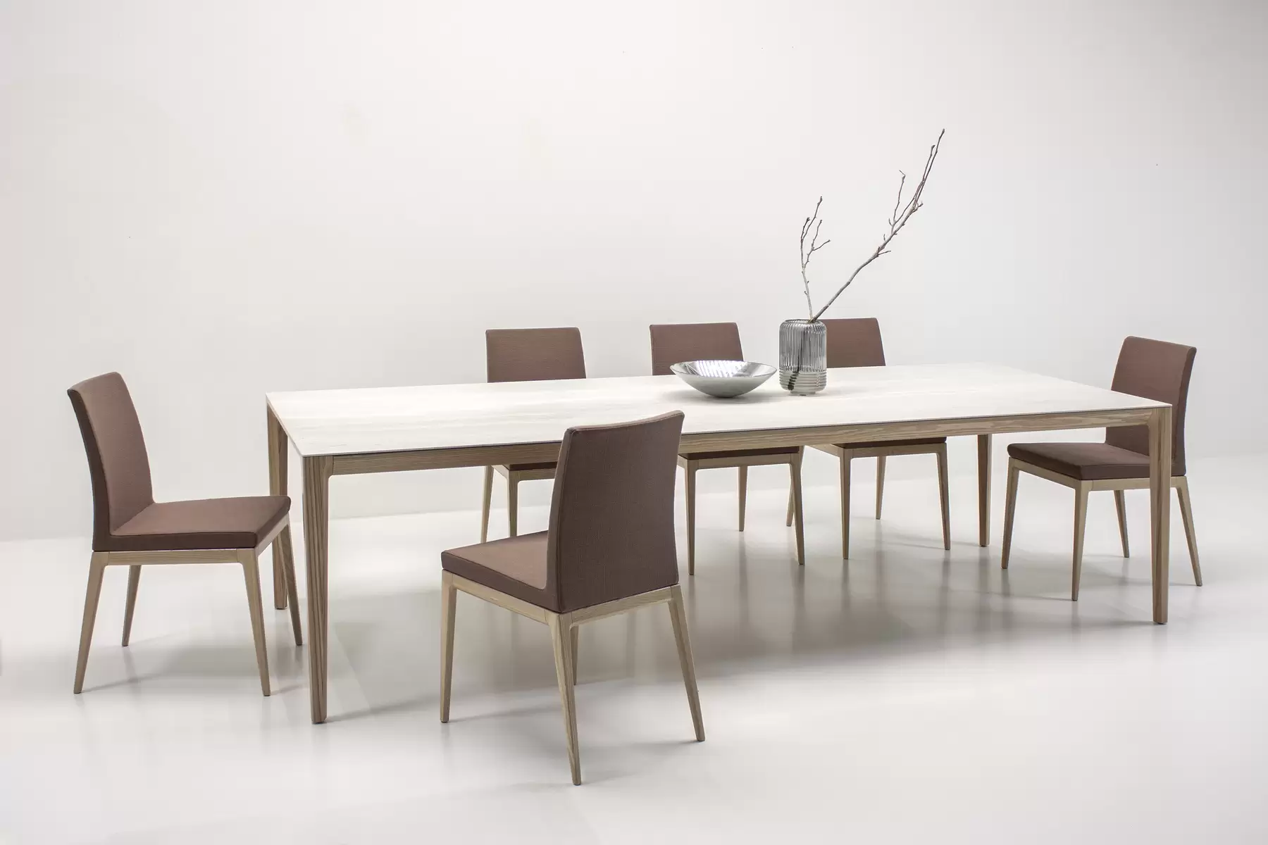 Конструкция стола включает тонкую скошенную столешницу, усиленную металлическим каркасом, что обеспечивает долговечность и прочность. Текстура массива ясеня на опорах и каркасе, добавляет натуральности и тепла, создавая ощущение природной гармонии. Стол доступен в длине до 2,75 метра, что позволяет удобно разместить до 12 человек. Благодаря этому Demy идеально подходит