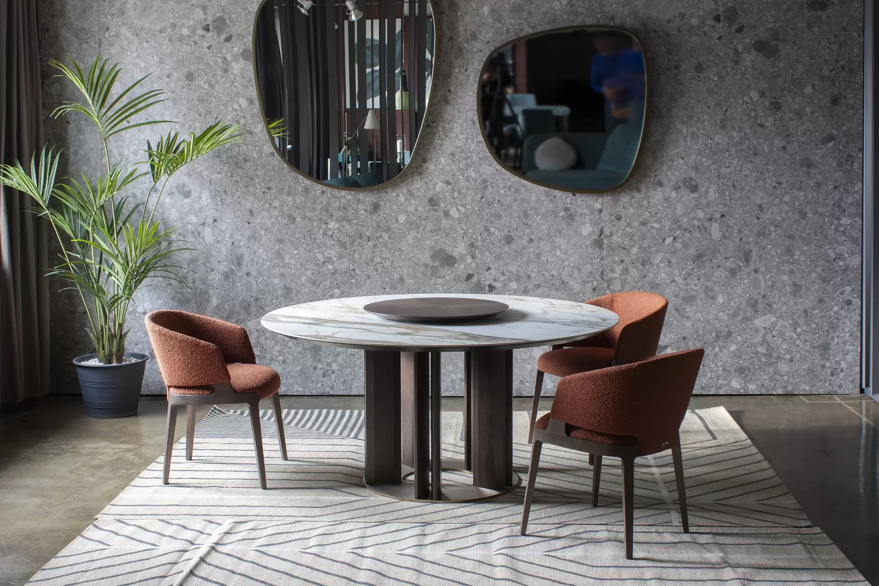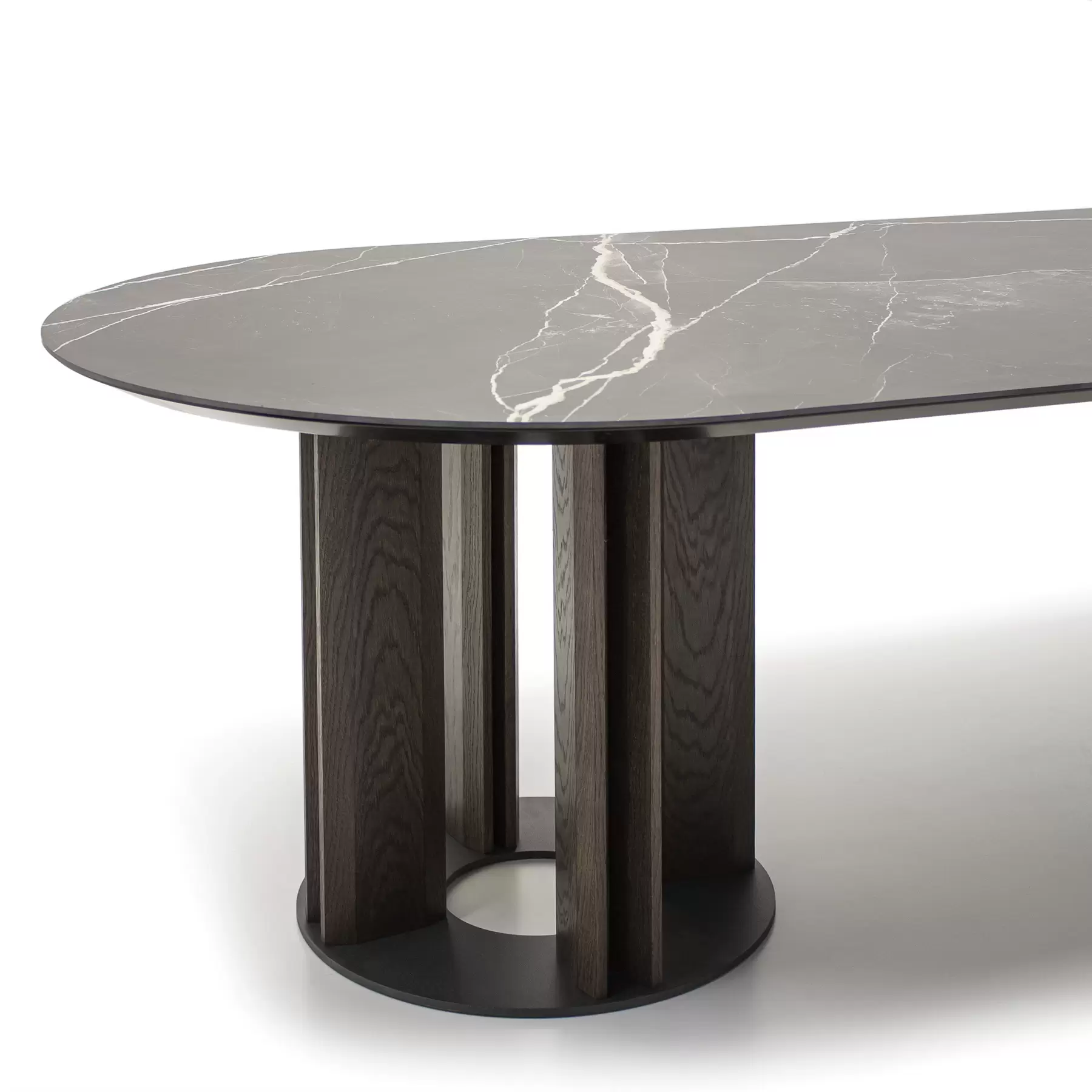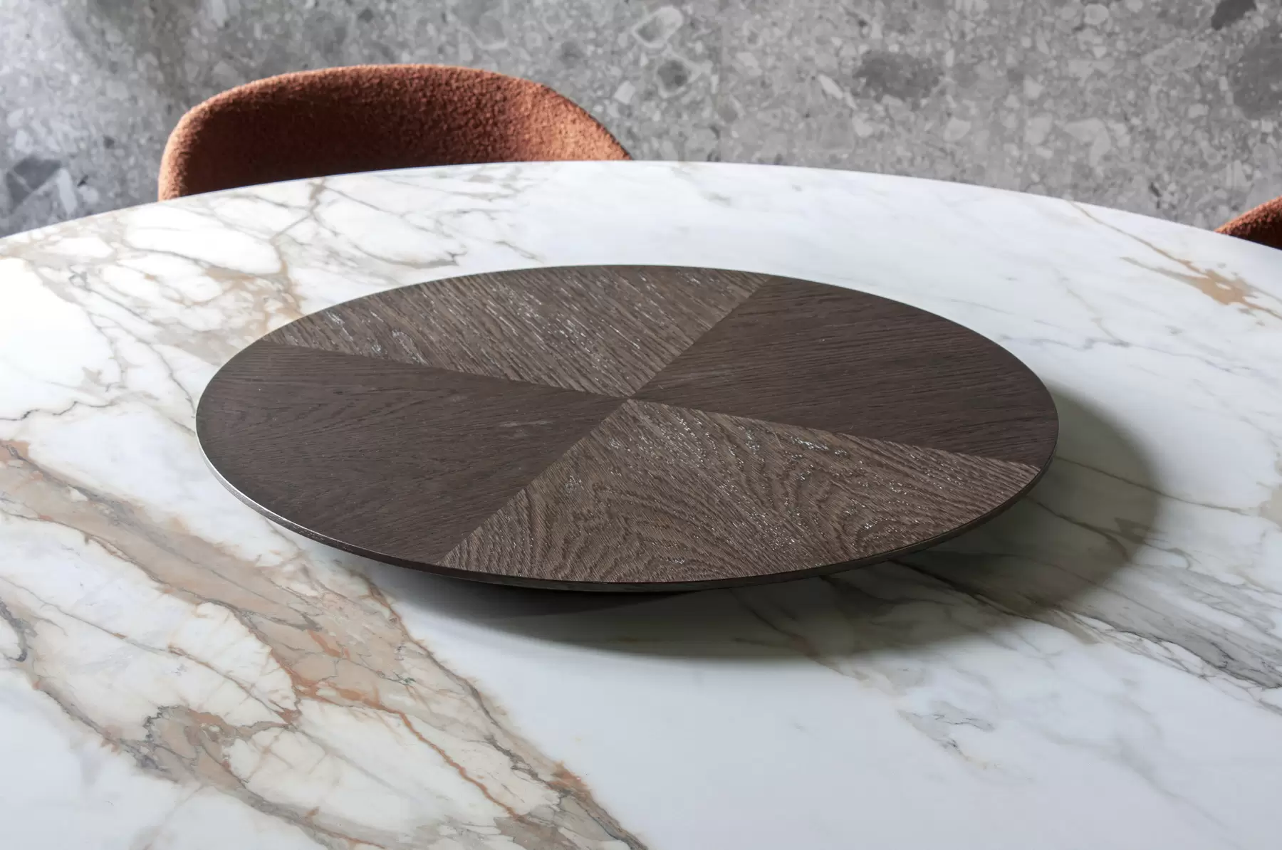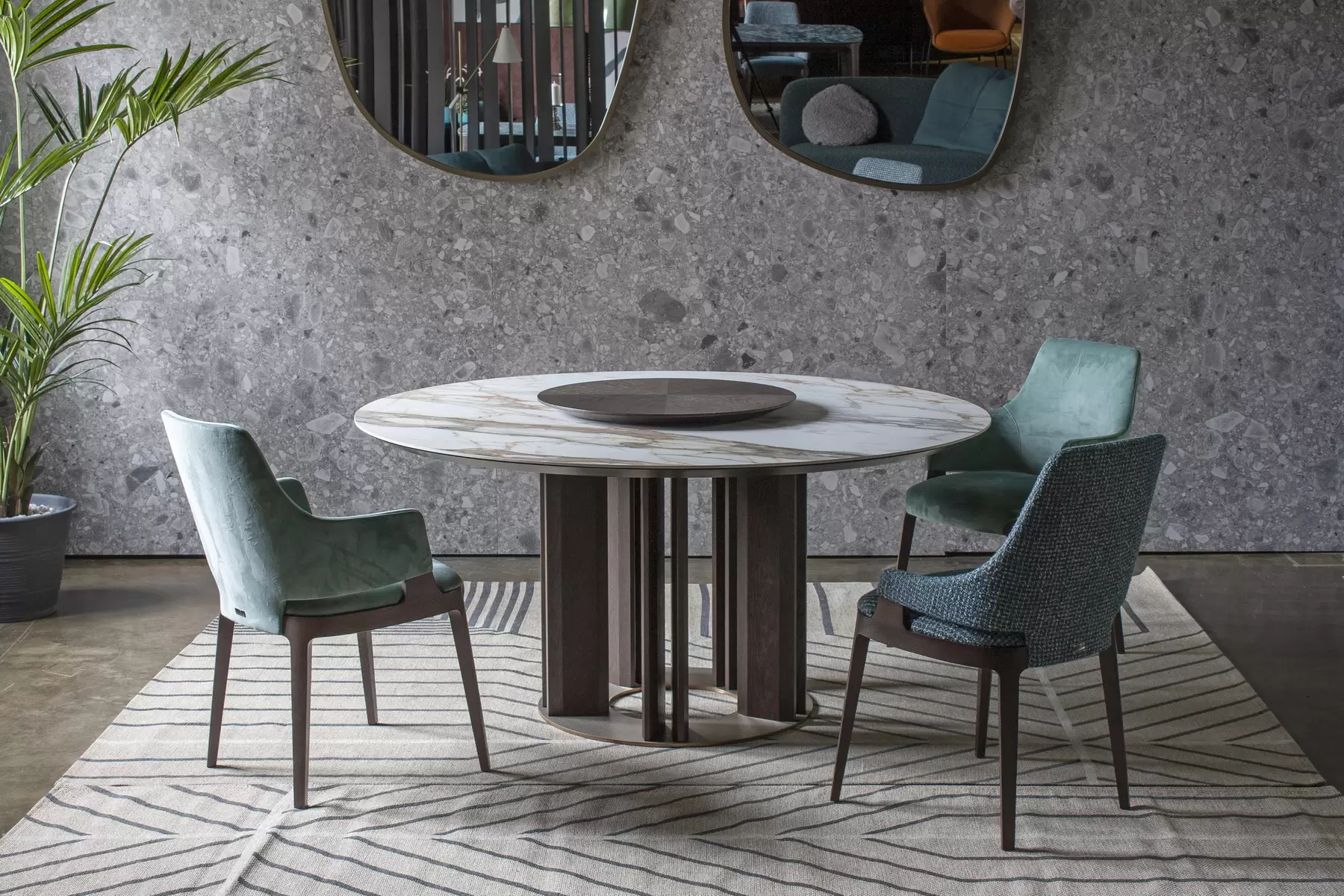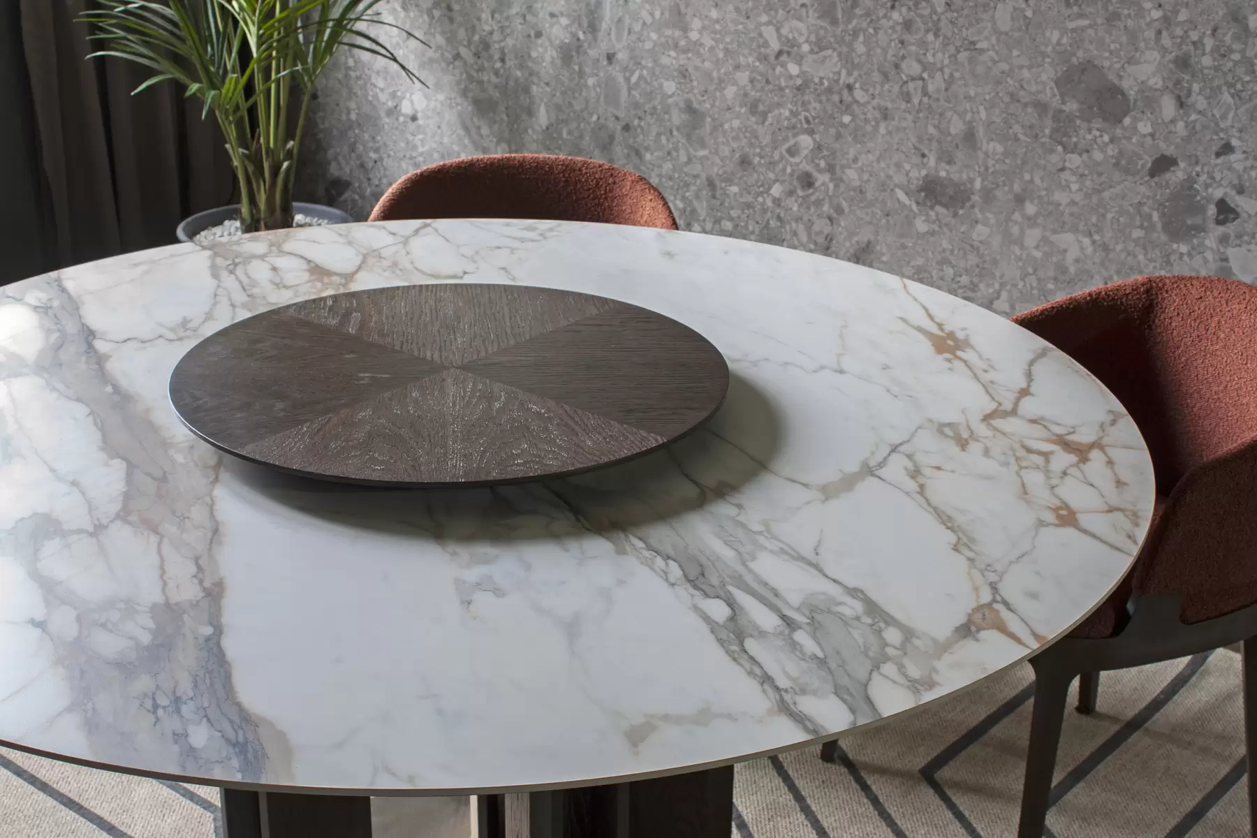 Tondo со своей идеальной геометрией позволяет удобно расположить максимальное количество гостей за столом. Центрально расположенная опора, декорированная деревянными “лопастями”, добавляет в дизайн архитектурности. Керамическая столешница смотрится лаконично и стильно. А дополняет композицию “ленивая Сьюзен” — практичный элемент, который обеспечивает сидящим за столом доступ ко всем блюдам, благодаря механизму вращения. Эта часть независима от основной конструкции и может использоваться в паре с другим столом.