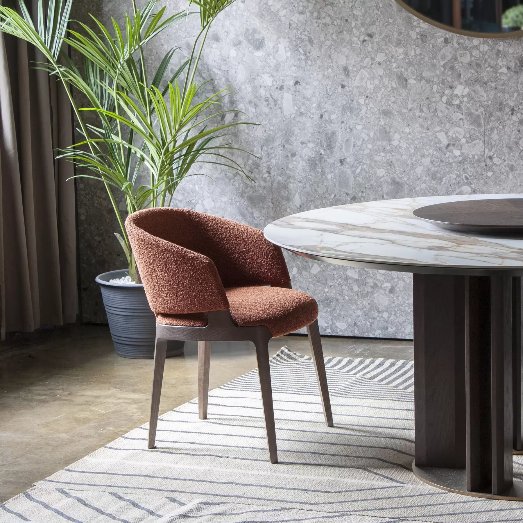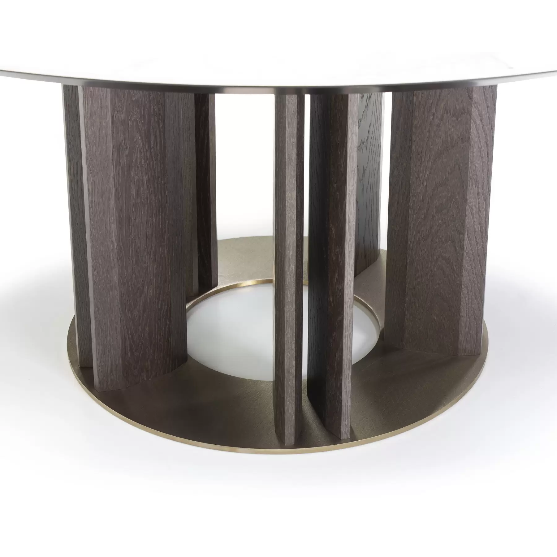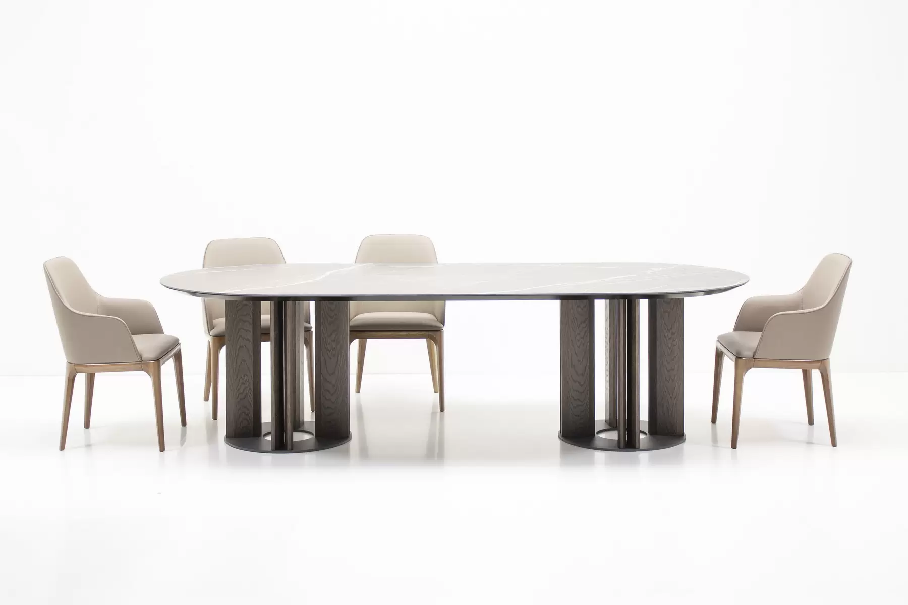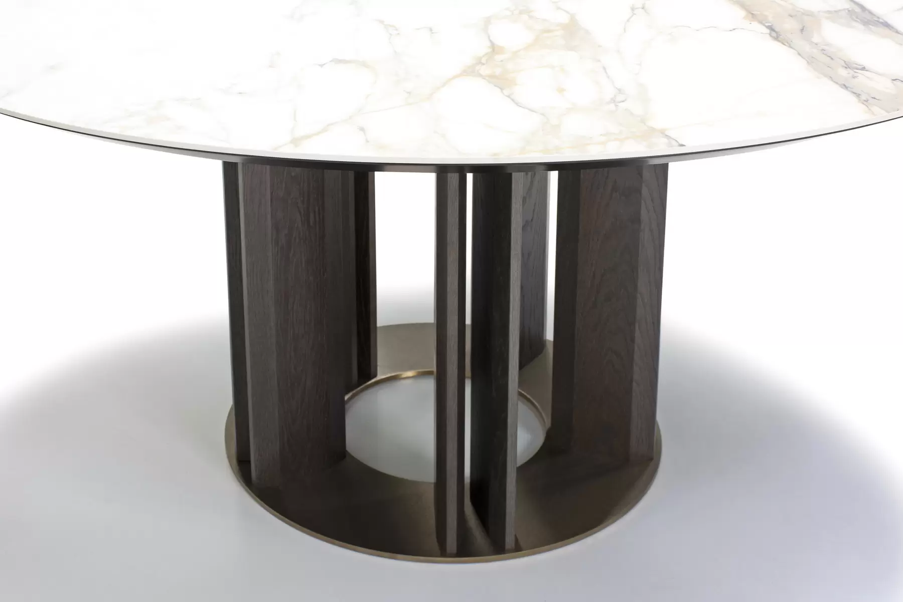Tondo со своей идеальной геометрией позволяет удобно расположить максимальное количество гостей за столом. Центрально расположенная опора, декорированная деревянными “лопастями”, добавляет в дизайн архитектурности. Керамическая столешница смотрится лаконично и стильно. А дополняет композицию “ленивая Сьюзен” — практичный элемент, который обеспечивает сидящим за столом доступ ко всем блюдам, благодаря механизму вращения. Эта часть независима от основной конструкции и может использоваться в паре с другим столом.