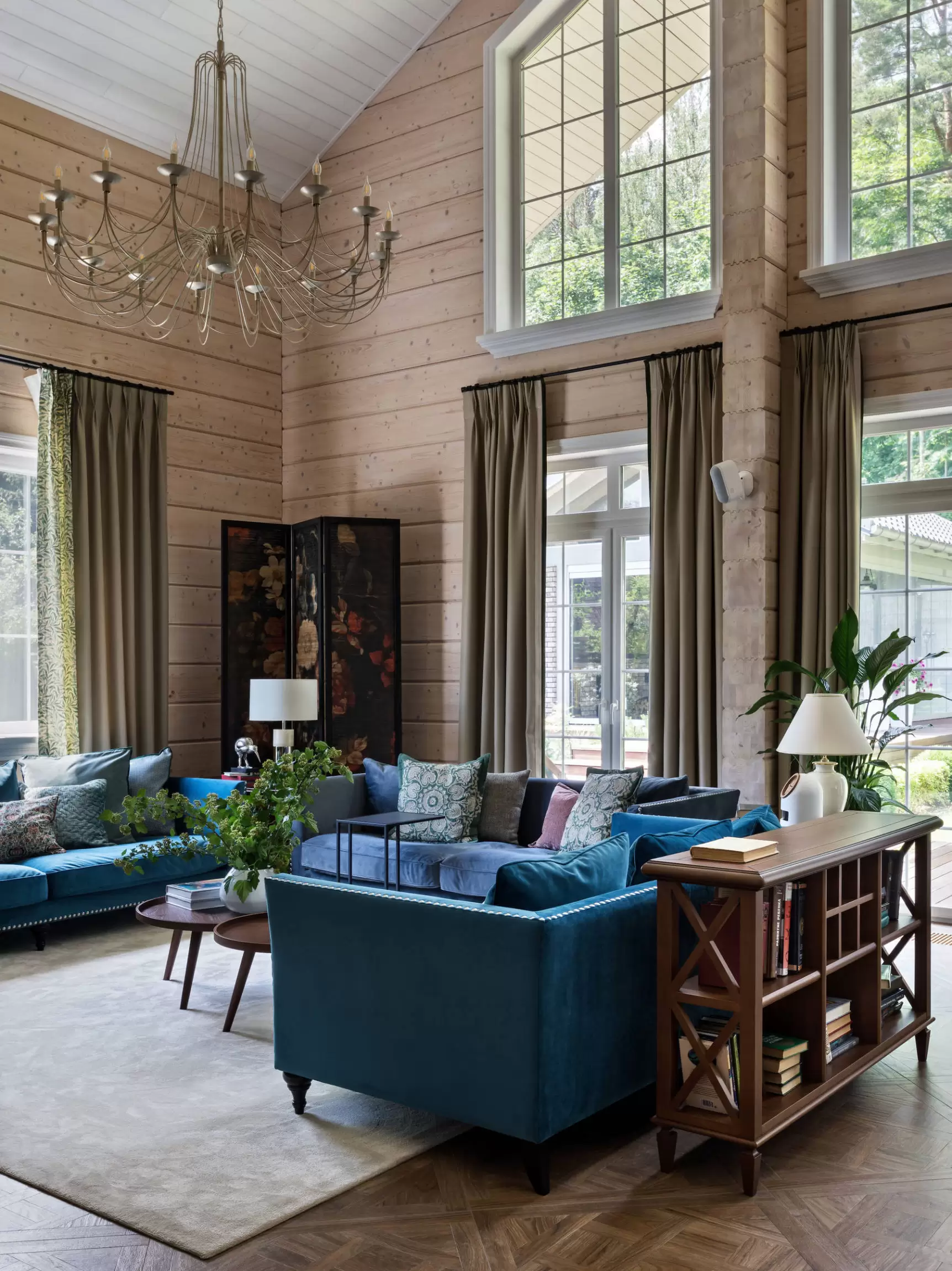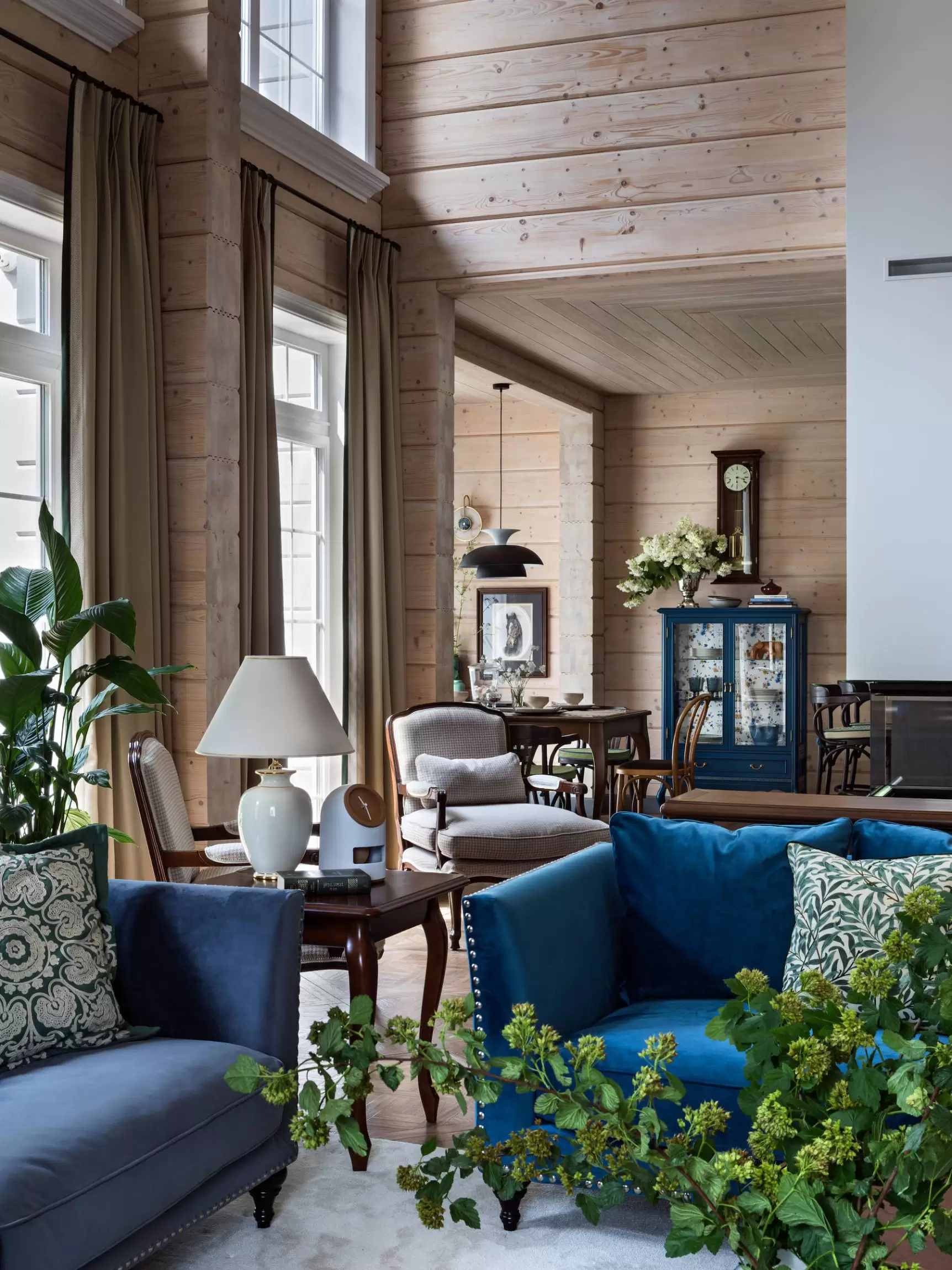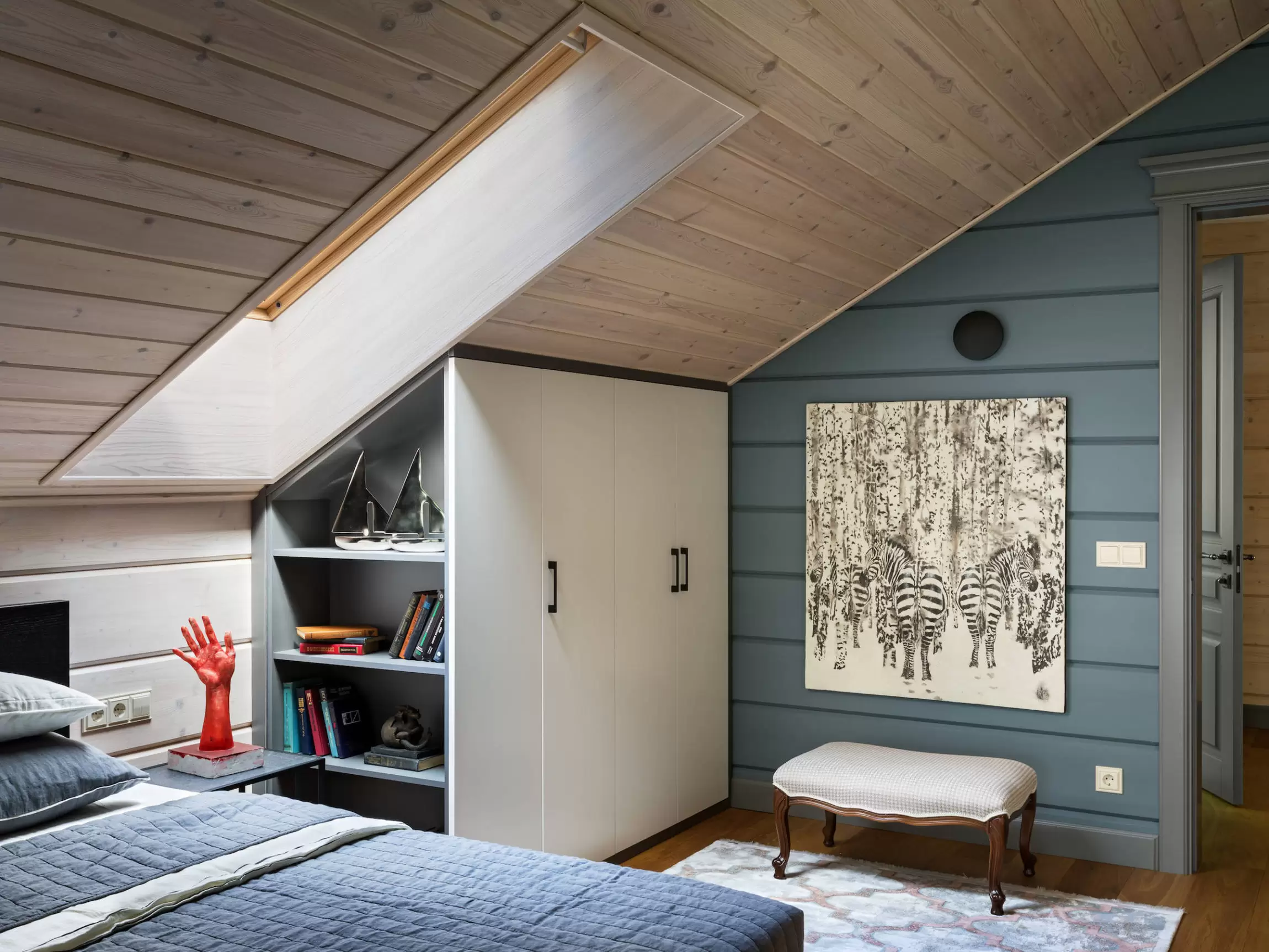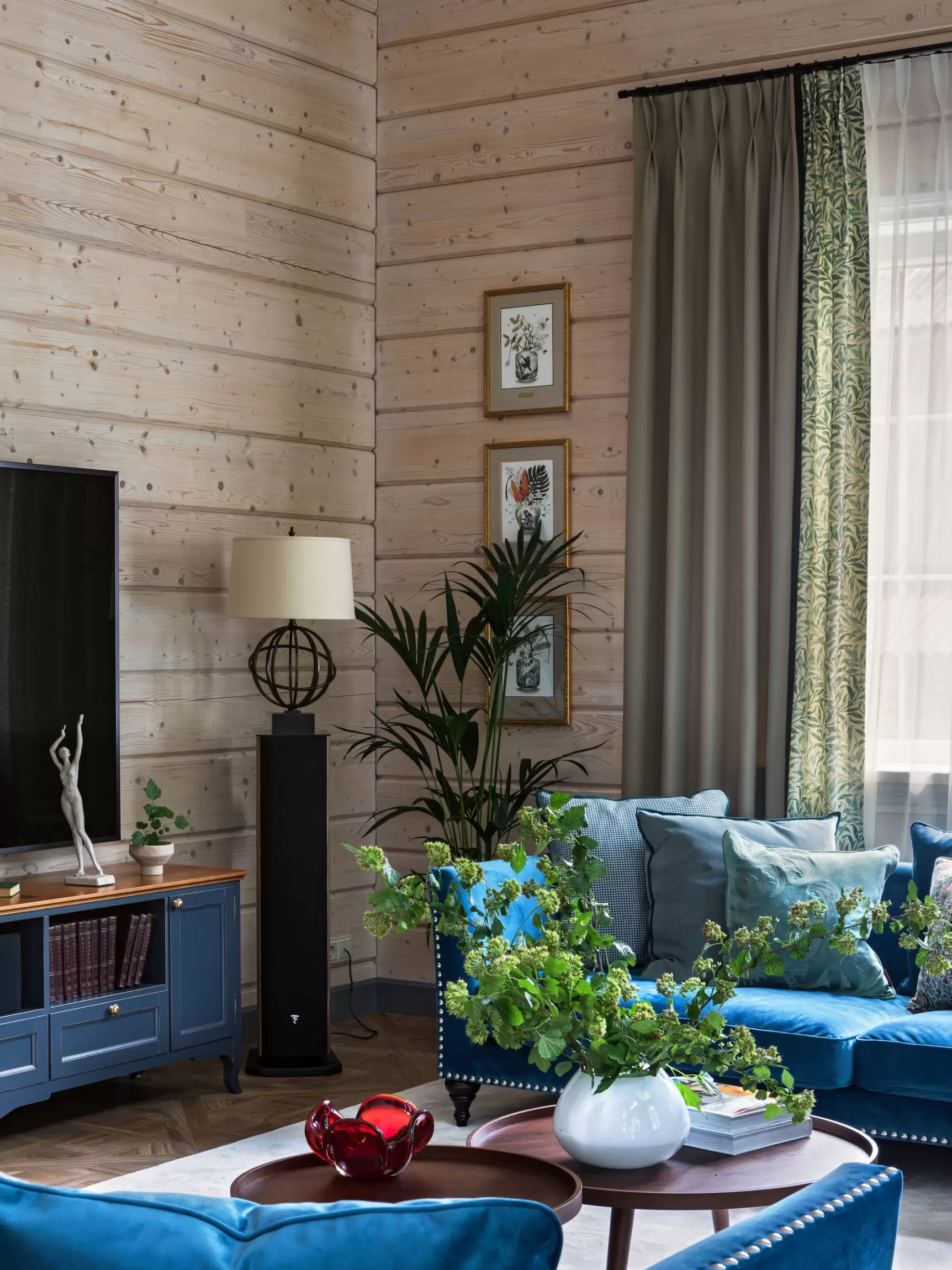Вся цветовая гамма построена на сочетании разных оттенков серого, синего и немного зеленого, а основным цветом выступает натуральный цвет дерева.