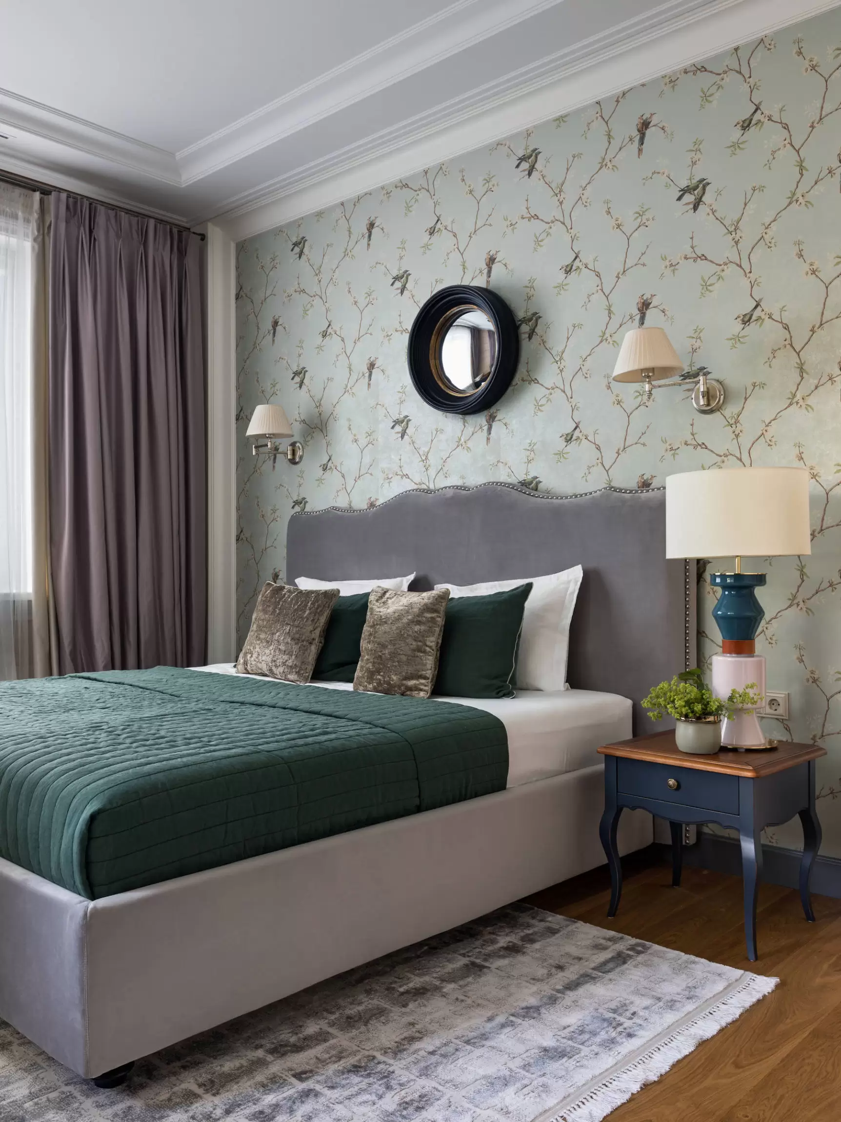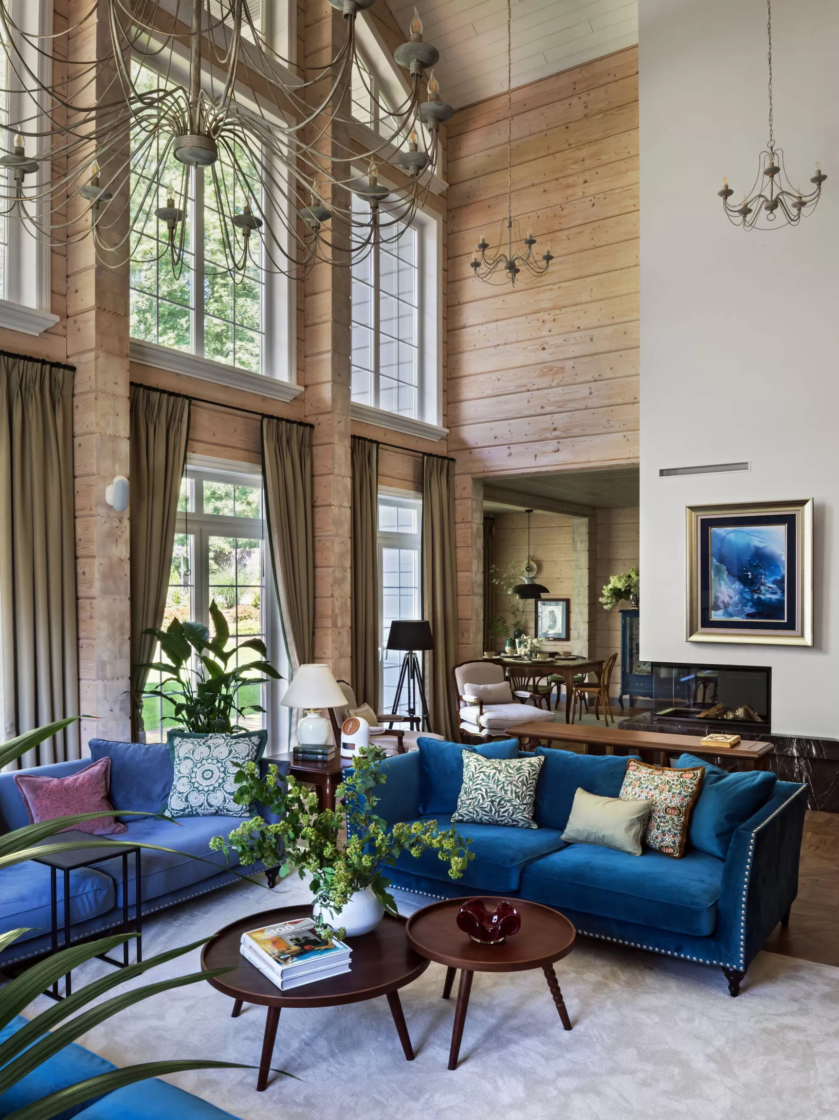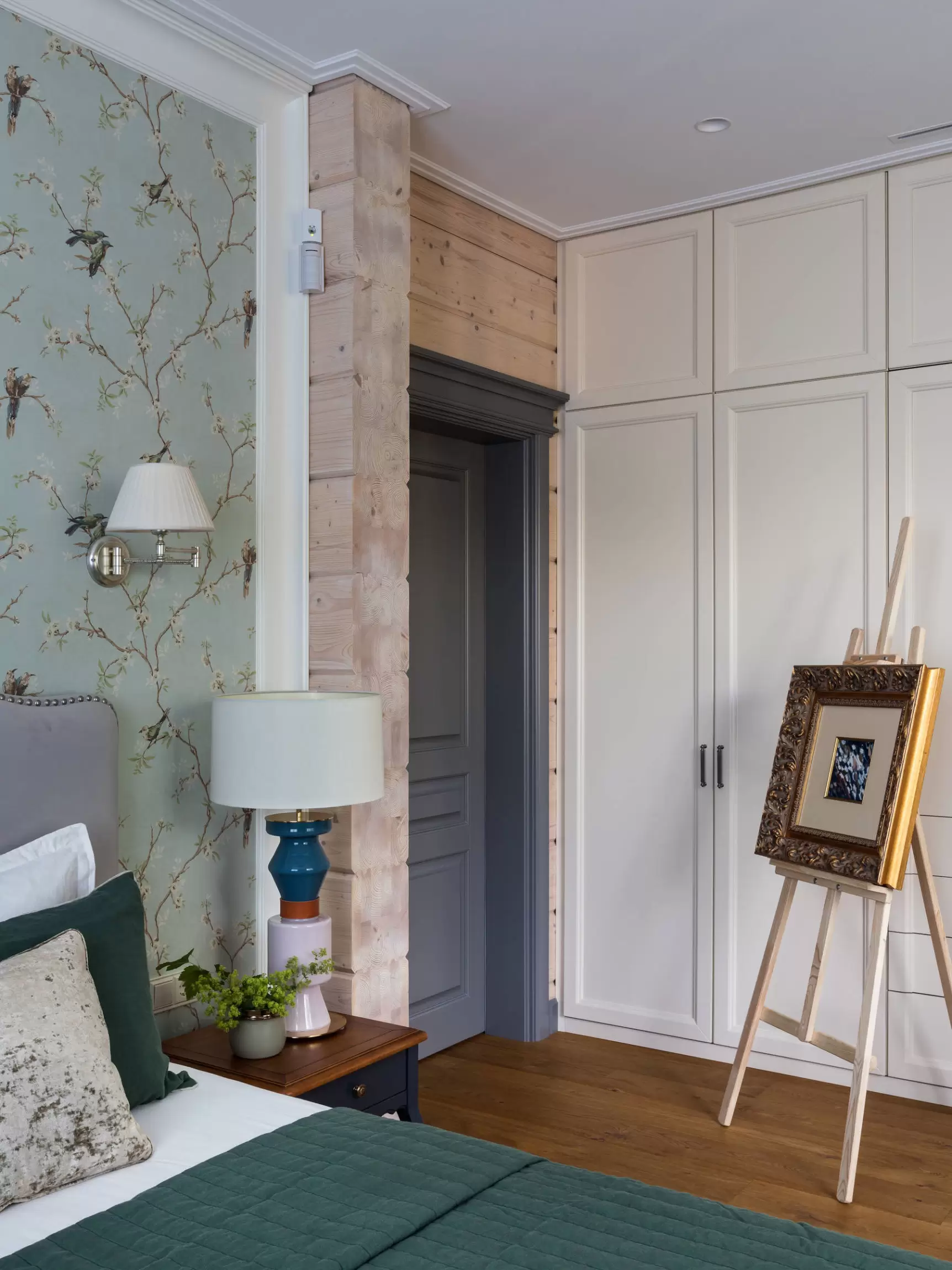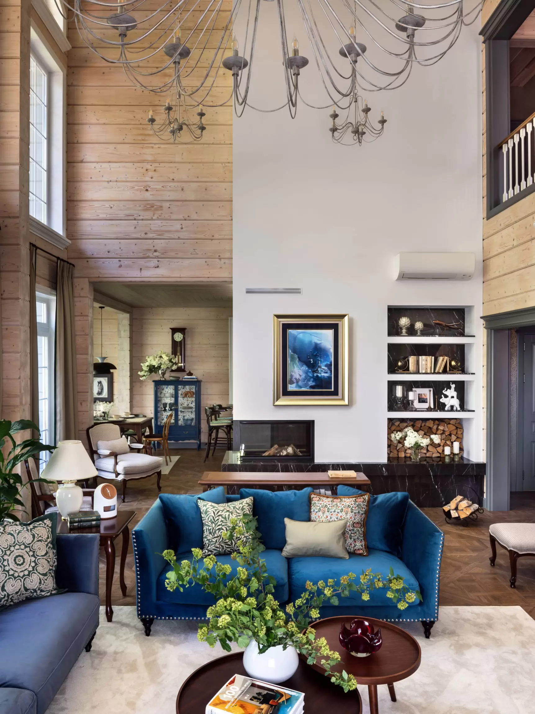 Вся цветовая гамма построена на сочетании разных оттенков серого, синего и немного зеленого, а основным цветом выступает натуральный цвет дерева.