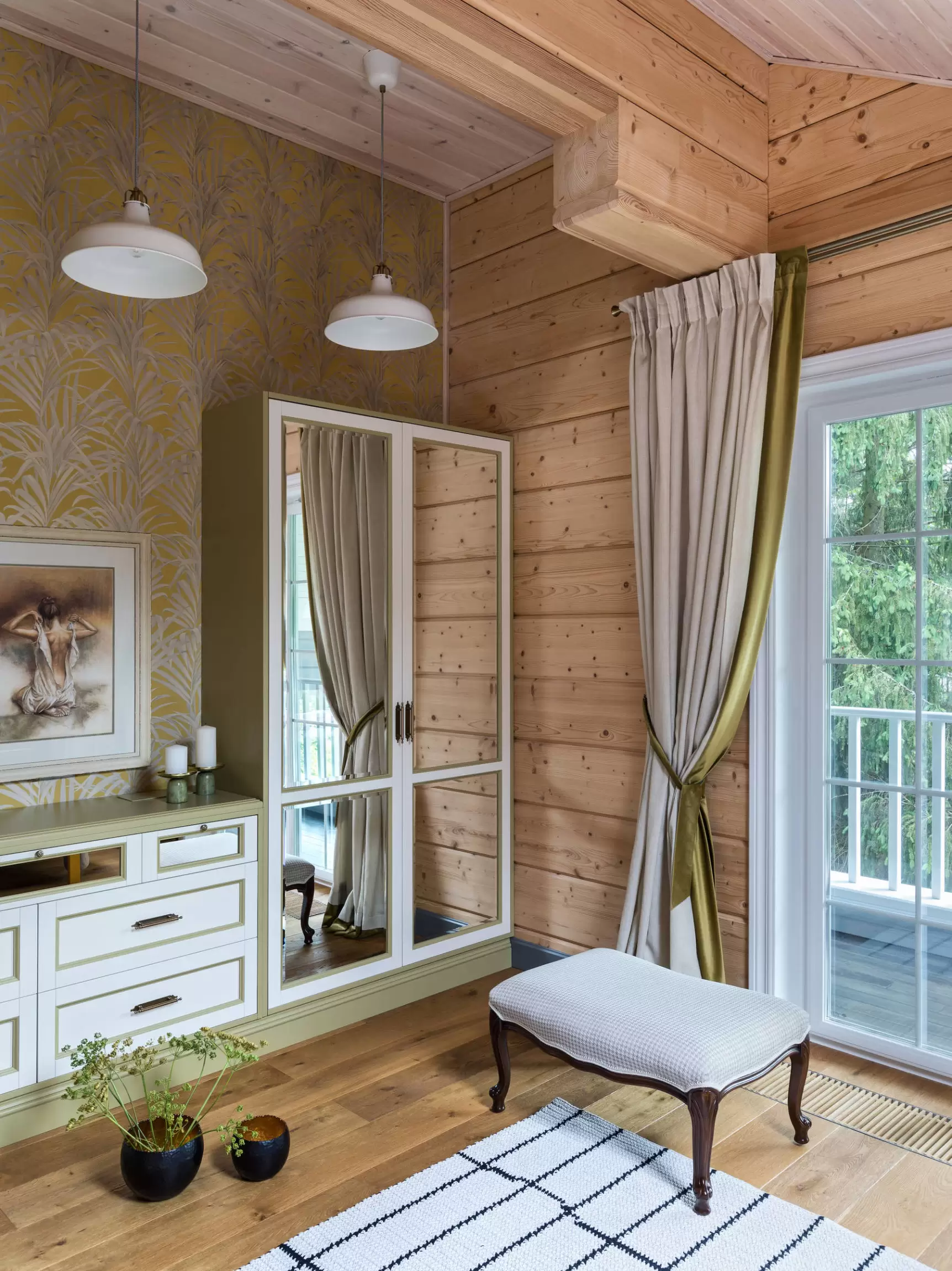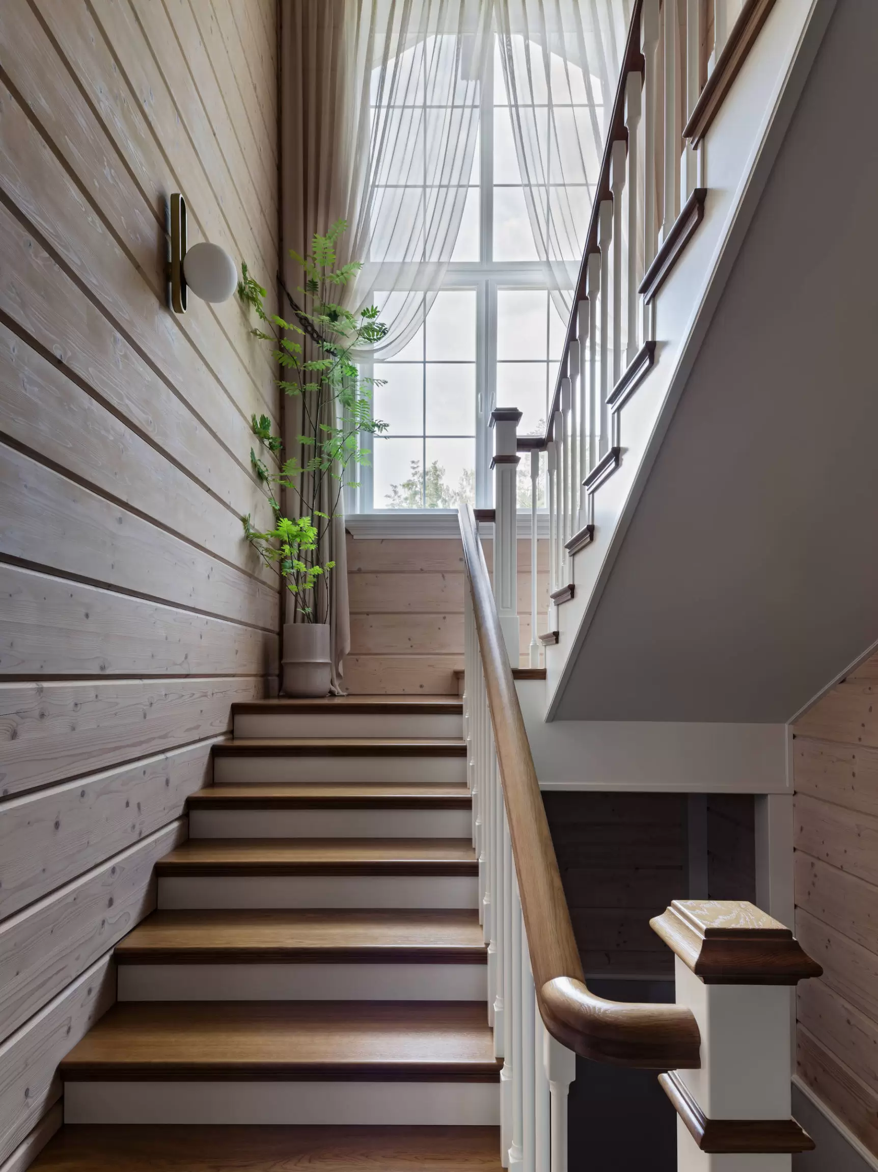 Высокое качество клеёного бруса и его эстетика дают возможность отказаться от использования в интерьере отделочных материалов. Почти все стены в этом доме выкрашены полупрозрачной белой краской, которая не скрывает фактуру дерева.